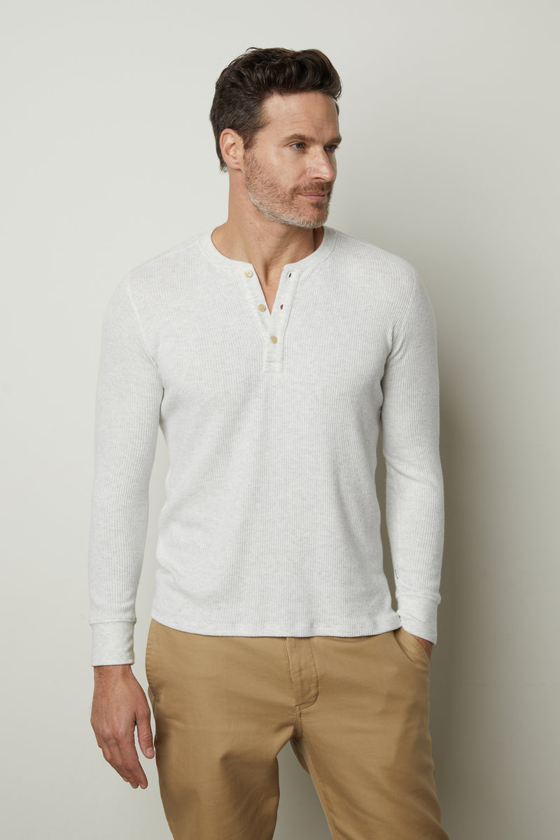 This 3 button henley is crafted from a ribbed knit that's comfortable and breathable, with banded cuffs for a finished look. It's the perfect piece for layering under a jacket or wearing solo.