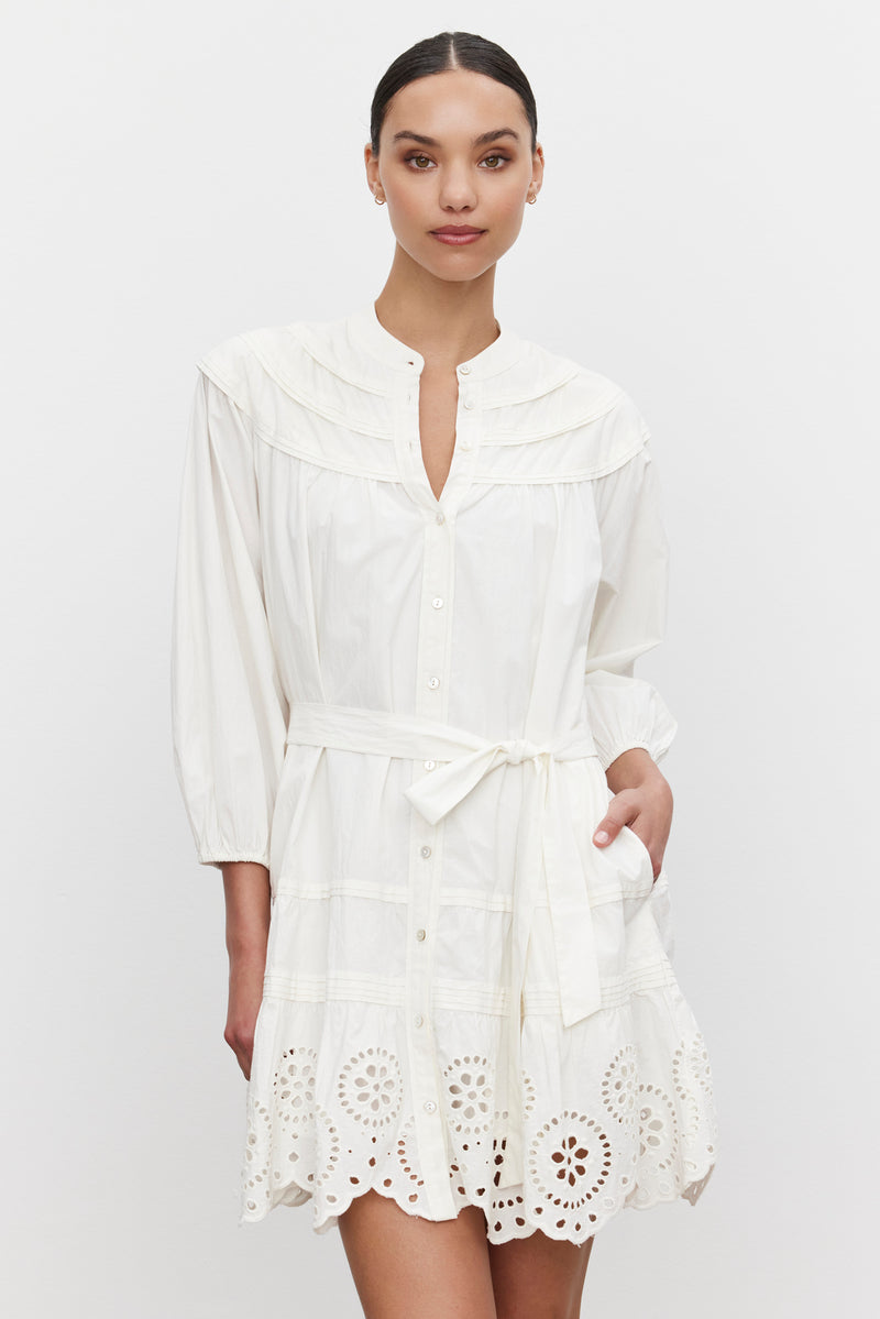 Crafted from a soft cotton, this dress features a full button front, a banded collar, and elastic cuffs. Detailed with pleated skirt tiers, a scallop hem with intricate cotton eyelet accents, and a detachable belt, it offers a customizable fit. Complete with a detachable slip for added coverage.