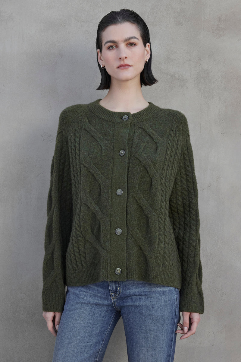 This cardigan is crafted from a cozy wool yak blend with a classic cable knit design. It features a five-button front and ribbed trims, providing both warmth and timeless style for cooler days.