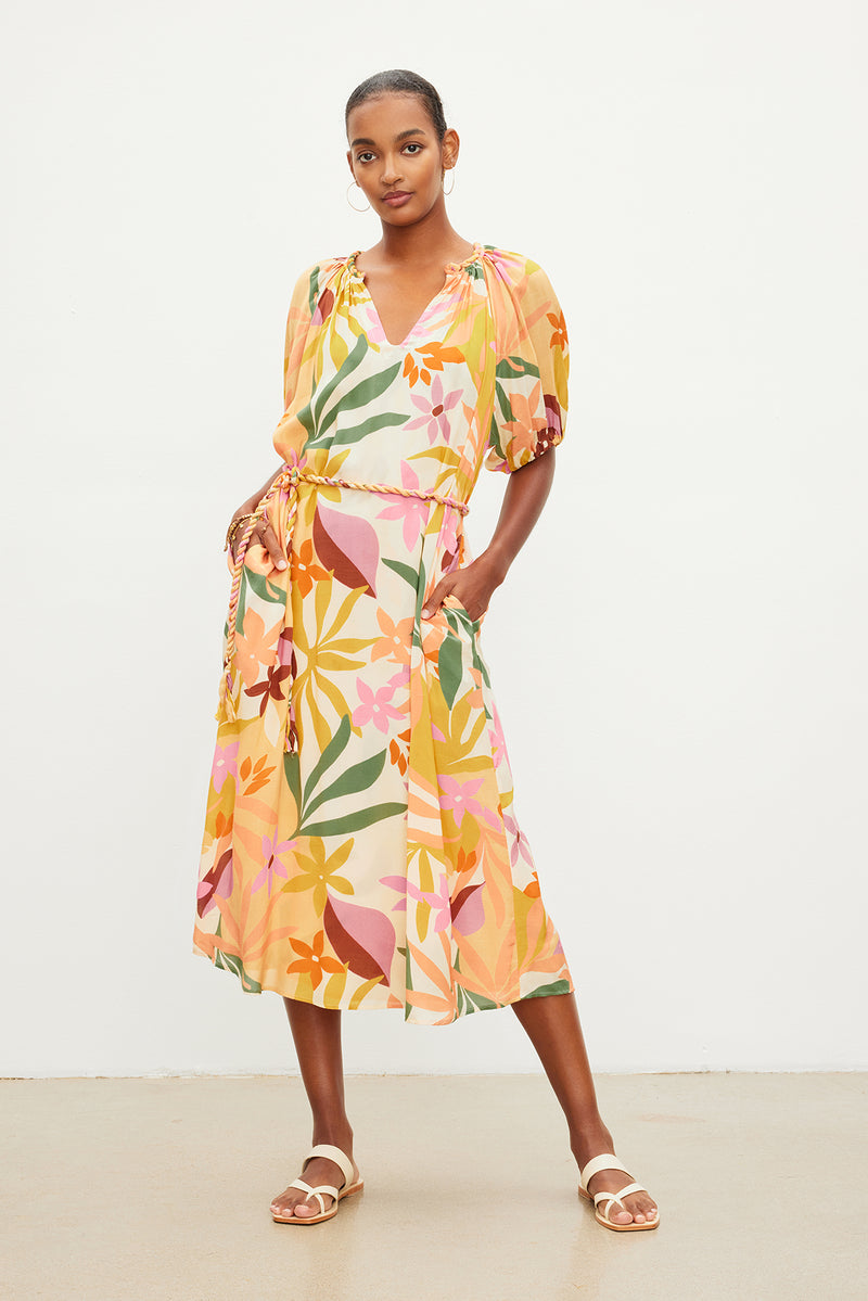 This printed viscose dress features a v-neckline and twist braid detail around the neckline. Raglan puff sleeves with elastic cuffs offer versatility, while a detachable twist braid belt allows you to customize your look.