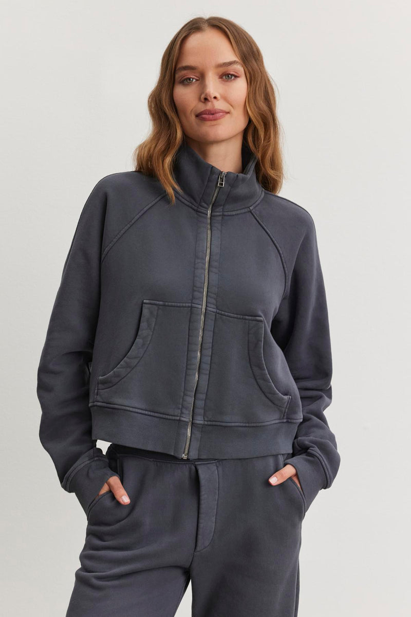 A wonderful zip sweatshirt of medium weight with great details!! Fits true to size, but is cropped. So soft and cozy like all my Velvet sweatshshirts, Love it!