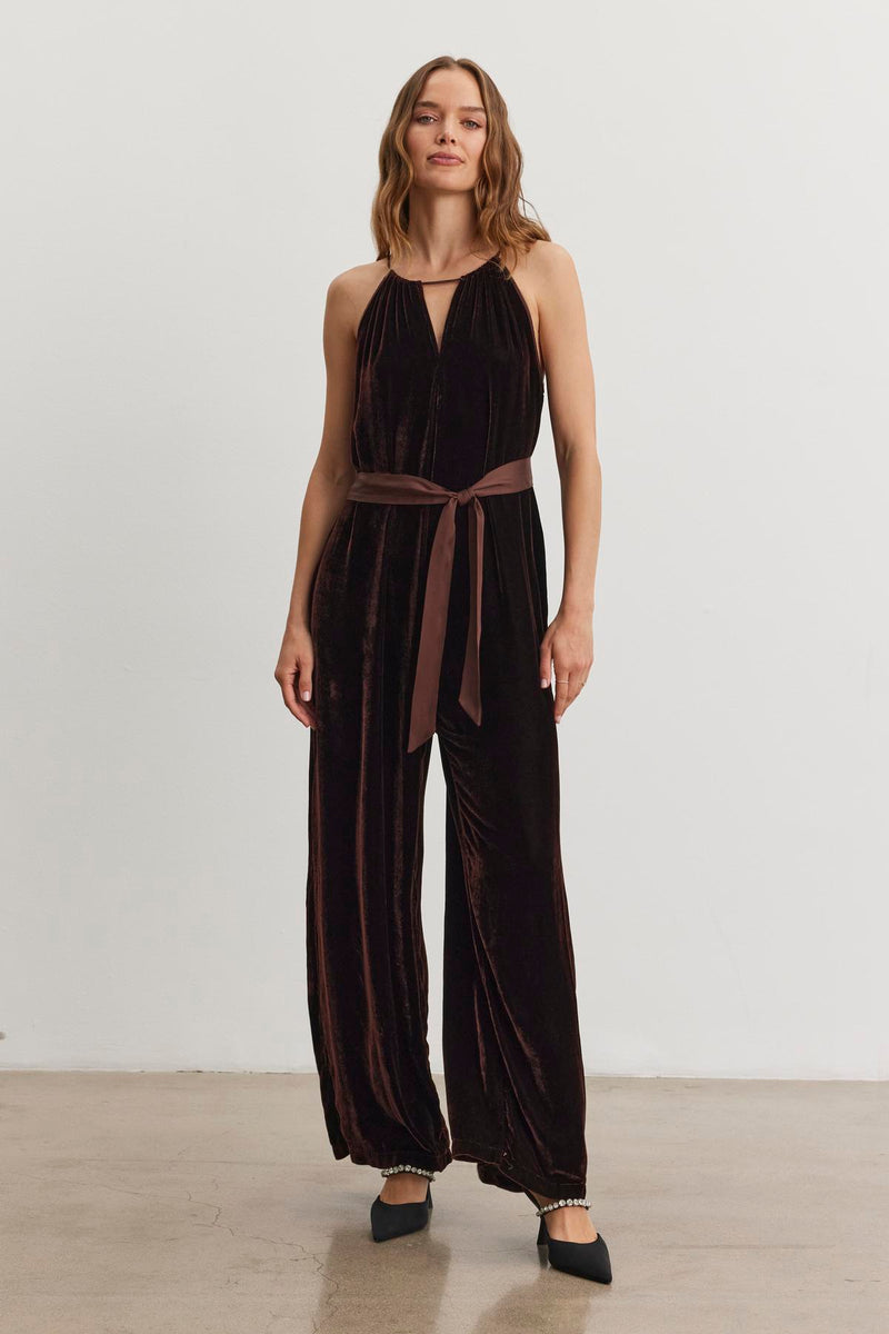 This silk velvet halter jumpsuit features a luxurious drape and a soft sheen. Designed with a wide-leg silhouette and a detachable belt to cinch the waist, this piece offers a flattering, elegant fit. Side seam pockets add a touch of functionality, while the ties at the rear neckline complete its sophisticated appeal.