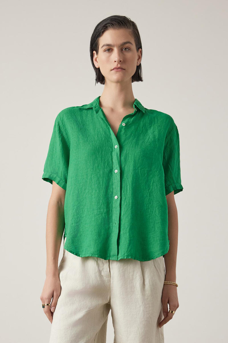 Made from breathable woven linen, this button-up shirt features a classic collar and short sleeves, perfect for warmer days. With banded cuffs, a rear pleat, and a scooped hemline, it's the epitome of effortless style.