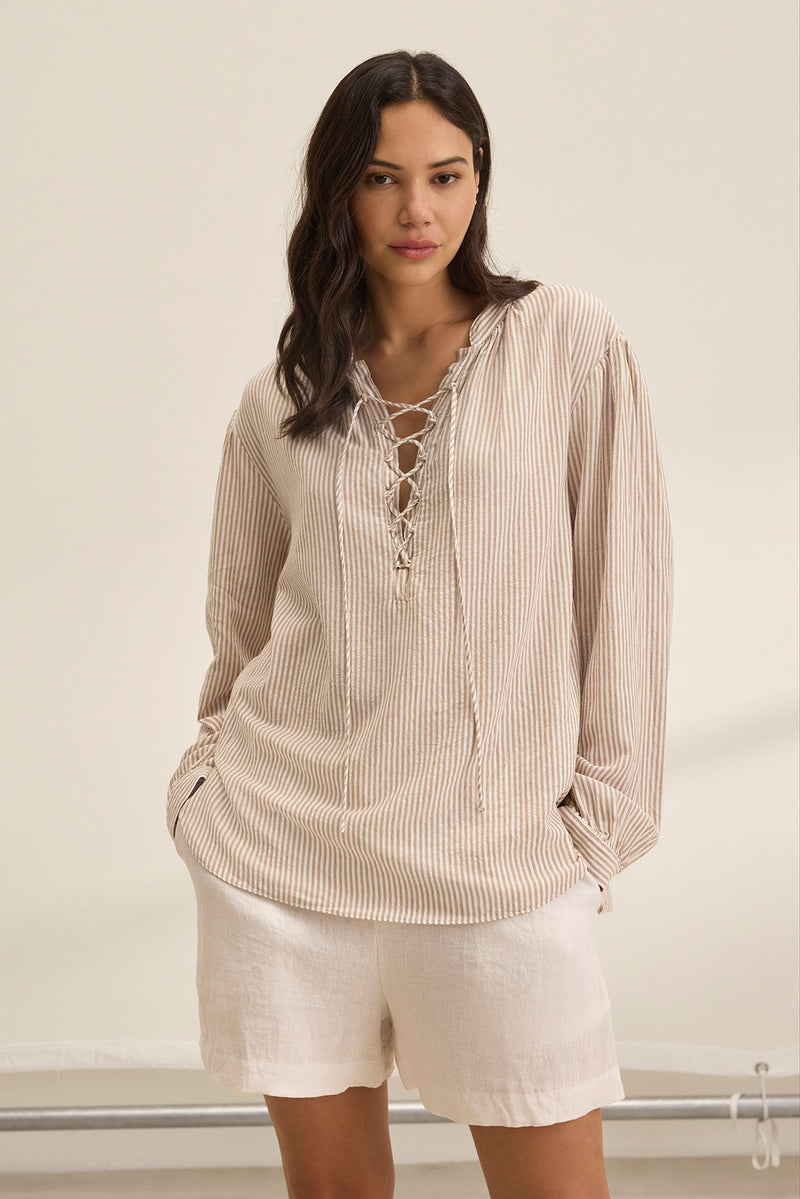 Crafted from a lightweight cotton blend, this striped top features a split neckline with ties and a scooped hemline. The relaxed, oversized fit makes it an easy choice for laid-back styling.