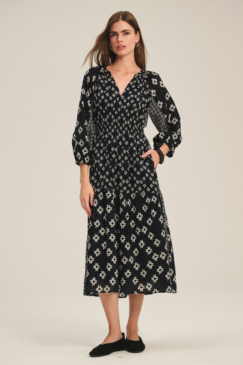 Crafted from light cotton, this dress features a flattering smocked waist and flowing midi-to-maxi length for effortless elegance. Sheer puff sleeves with elastic cuffs and a V-neckline add feminine touches, while side seam pockets offer practical style. Fully lined for comfort, it’s perfect for day or evening wear.
