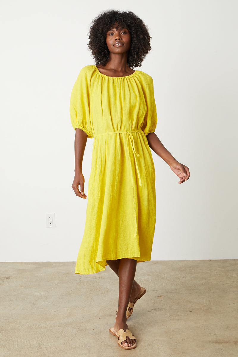 This midi dress is chic and timeless, crafted from 100% linen. The elastic neckline and cuffs create structure and flexibility, allowing you to wear this dress off or on the shoulder. The detachable belt adds definition and versatility to your look, perfect for any occasion.