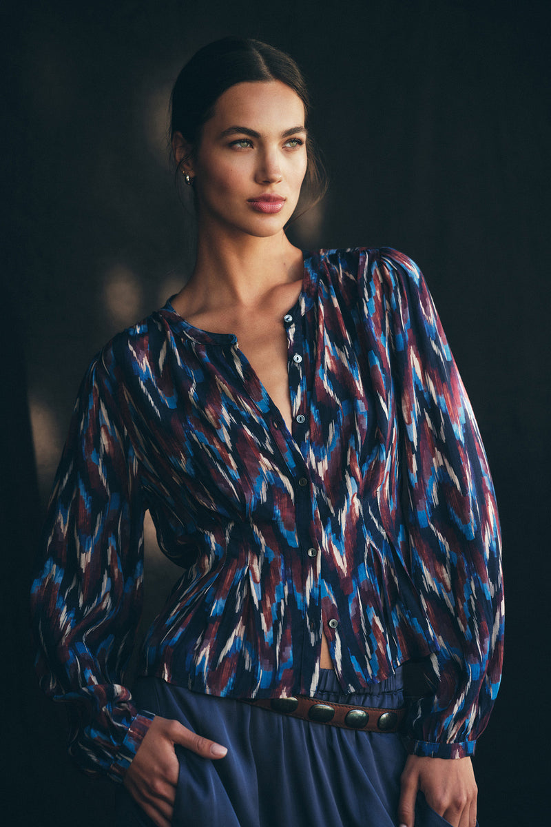 A woman poses against a dark background wearing the ESTELLA BLOUSE from Velvet by Graham & Spencer, a long-sleeve, button-up lightweight cotton blouse featuring a blue, red, white, and black abstract pattern and a belted blue skirt.