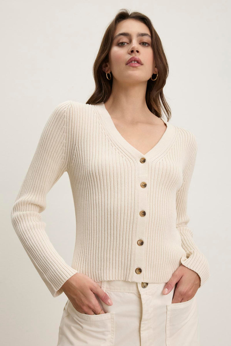 The 5-button front and cropped silhouette add a touch of flair, making this cardigan a versatile choice for transitioning between seasons. The textured cotton ribbed knit enhances the chic appeal of this piece.