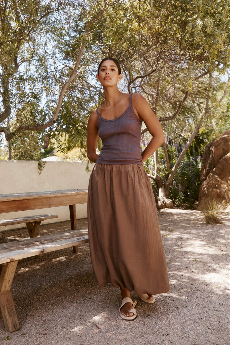 Crafted from silk cotton voile with a subtle sheen, this skirt features a pull-on design with a fully elastic waist for ease and comfort. Side seam pockets add functionality, while the bubble hem creates a soft, voluminous silhouette.