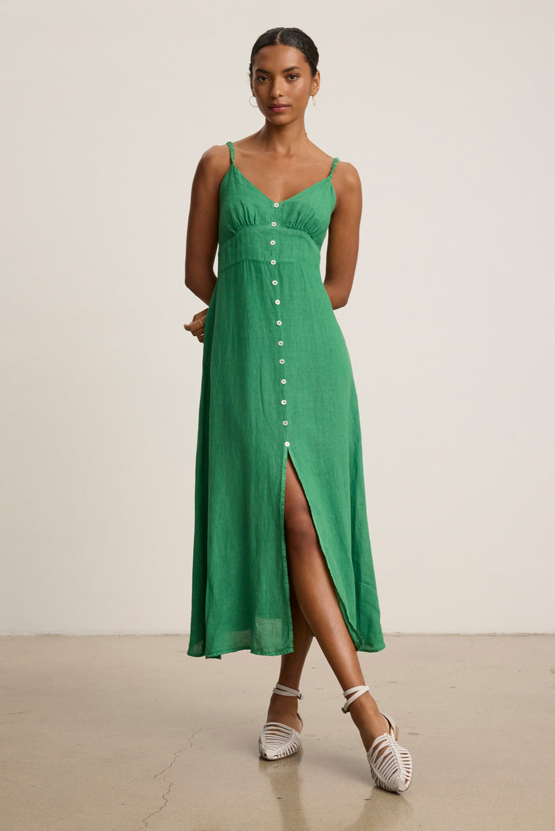 Featuring a decorative button front and a flattering V-neck, this tank dress is designed for both style and comfort. The elastic straps and rear waist create a perfect fit, while the front slit hem adds a chic touch. Made from breathable woven linen, it’s an easy choice for a relaxed yet polished look.
