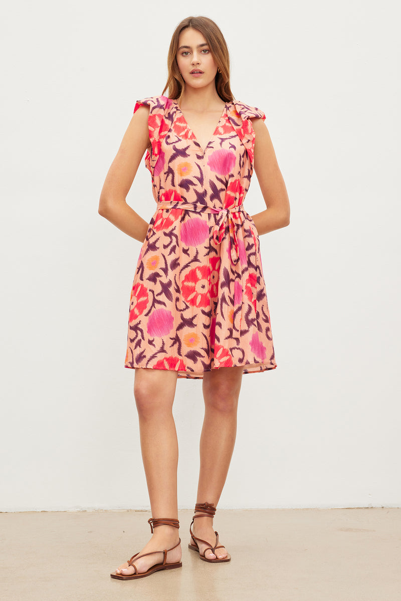 Crafted from printed silk cotton voile, this dress features a v-neckline and flutter cap sleeves, adding a touch of elegance. The detachable belt allows for versatile styling, and the dress is fully lined for added coverage.