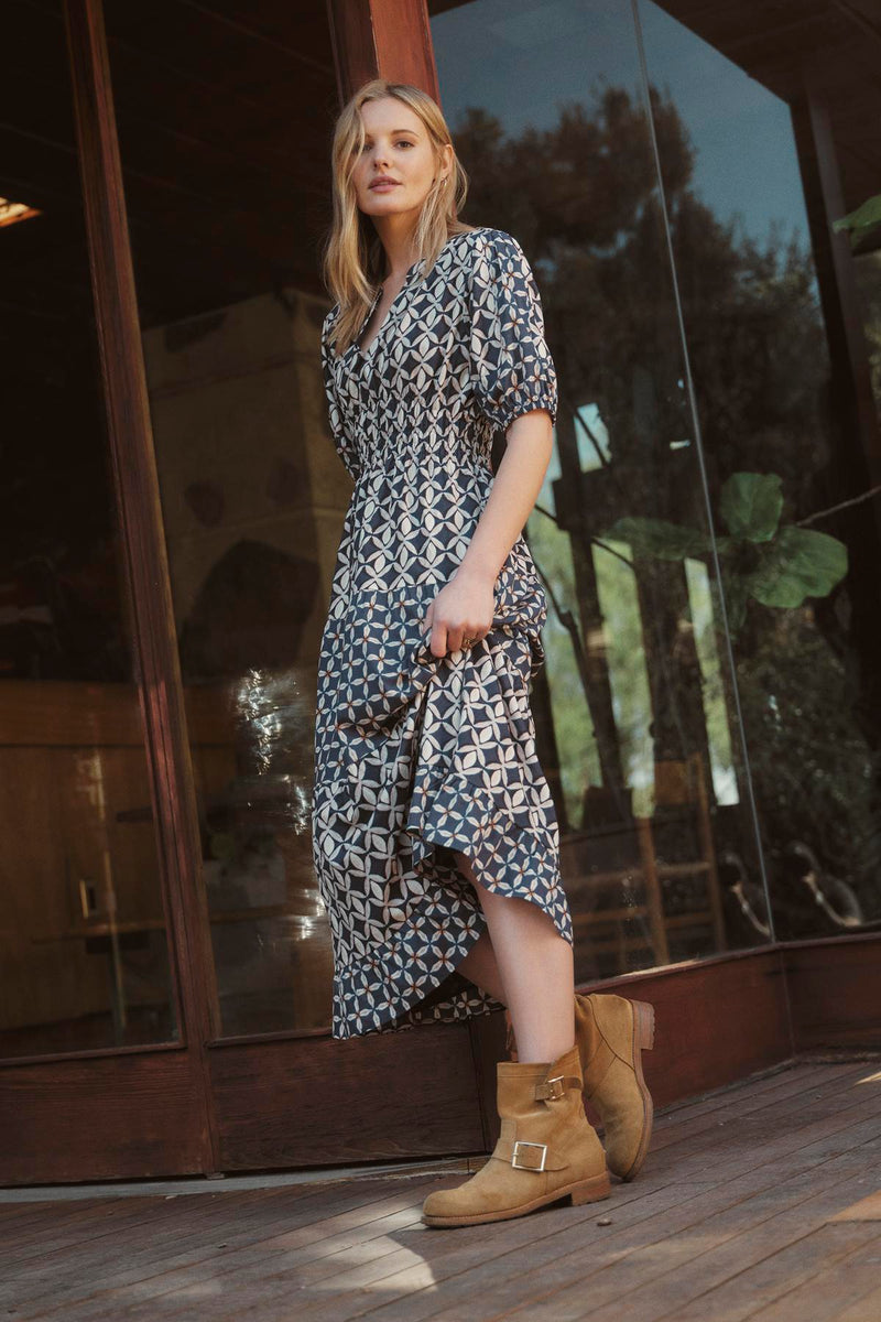 Made from printed cotton cambric, this dress features a v-neckline and midi length, offering a timeless silhouette complemented by a two-tiered skirt and elastic shirred waist. Puff sleeves with elastic cuffs and side seam pockets add functional flair, perfect for day-to-night versatility.