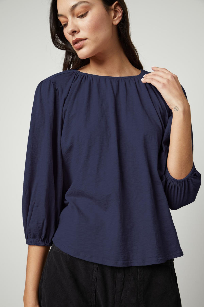 Crafted from a lightweight cotton slub fabric for a relaxed silhouette. Its 3/4 sleeve length and puff sleeves create an effortless style, while the elastic neckline and cuffs provide a comfortable fit.