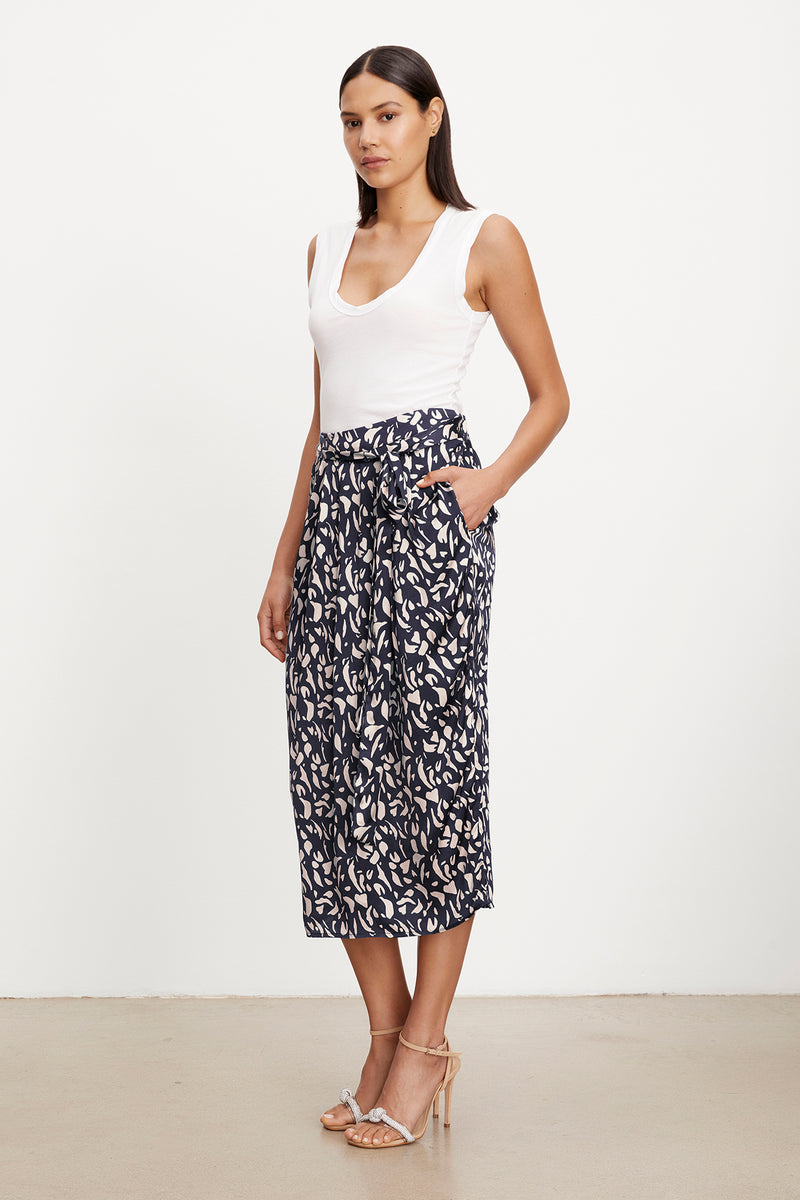 Combining luxury and practicality with its midi length and pleated front. This abstract printed satin skirt also features an elastic waistband, rear vent, and inseam pockets for ease of wear. Perfect for daily or special occasions.