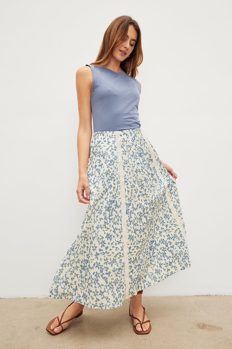 Adorned with an elastic waist for ease, this floral print, subtle striped maxi skirt has a textured cotton feel. The delicate lace insets elevate this versatile addition to your wardrobe.