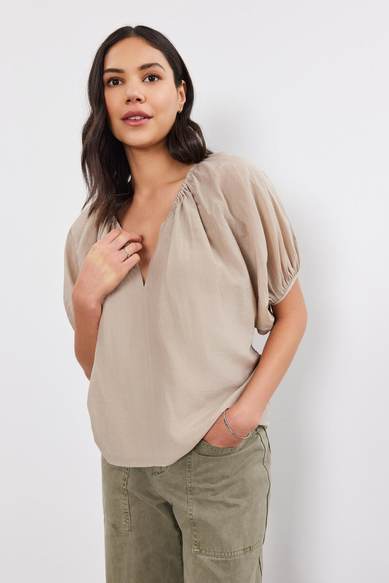 Crafted from a silk cotton voile for a luxurious feel with a subtle sheen. Featuring a flattering v-neckline and exaggerated puff sleeves, its elastic neckline and lined body ensure comfort and ease.