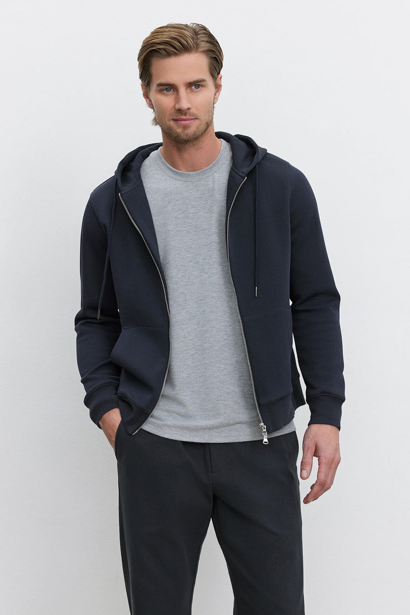 Featuring a drawstring hood with metal tips, a double zipper, and front pouch pockets, this hoodie is made from a textured cotton blend double face piqué. It's a perfect blend of comfort and practicality.