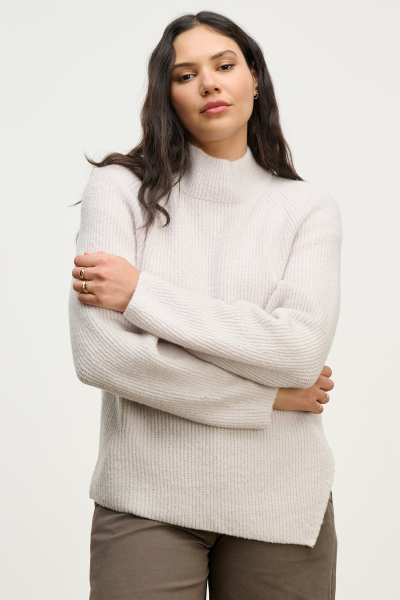 A fresh take on cold-weather dressing, this sweater stands out with its asymmetrical hem and side slit detail. Designed with a mock neck, raglan sleeves, and a relaxed fit, it’s crafted from a warm wool blend that balances comfort and modern style.