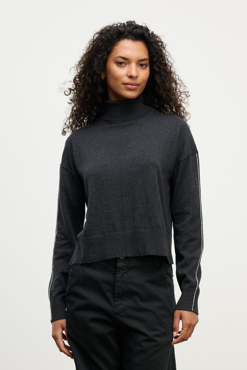 This sweater blends cotton and cashmere for cozy comfort. It features a relaxed boxy fit, turtleneck, and a contrast stitch stripe down the sleeves. A side split hem and clean center front and rear seams add style and ease, making it a versatile and fresh addition to any wardrobe.