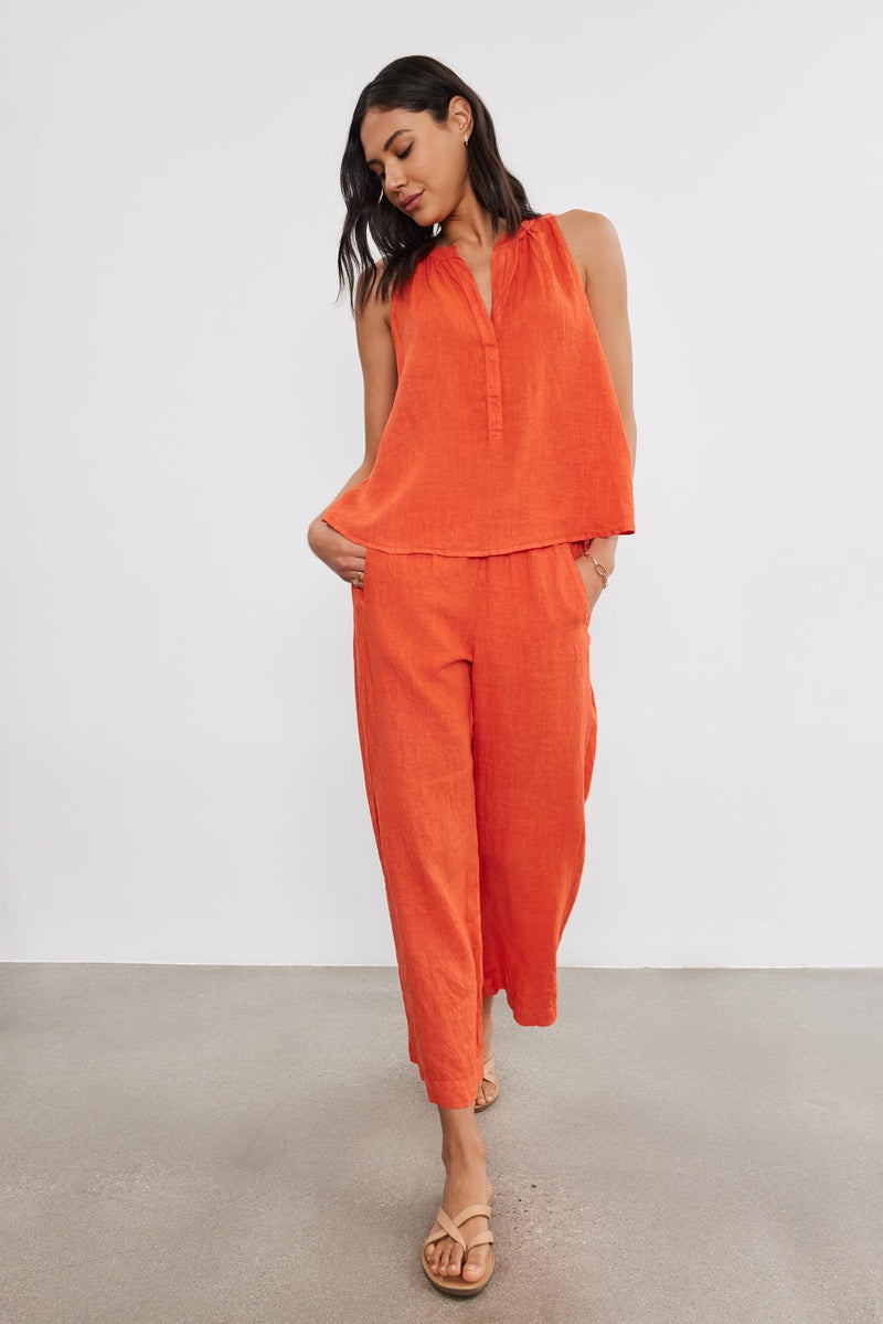 The perfect pant. Crafted from a lightweight linen woven, these pull-on trousers have an elastic waist, a relaxed leg with a slight ankle crop, and the perfect ease of a gorgeous warm weather day.