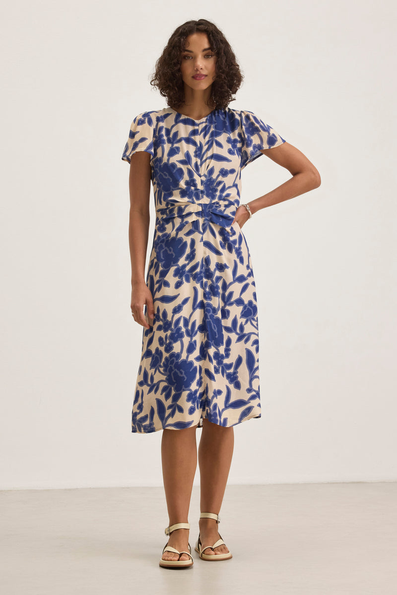 Crafted from printed viscose royal crepe, this dress features a round neckline and delicate sheer cap sleeves. Front pleat details add subtle texture, while the lined body ensures coverage. Finished with a rear zipper closure for a seamless fit.