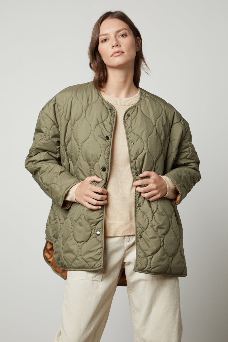 Inspired by the classic quilted lining of vintage military jackets, this is the perfect jacket for fall and winter. Jumbo popper buttons, large front pockets to keep hands warm and an exaggerated scoop hemline.