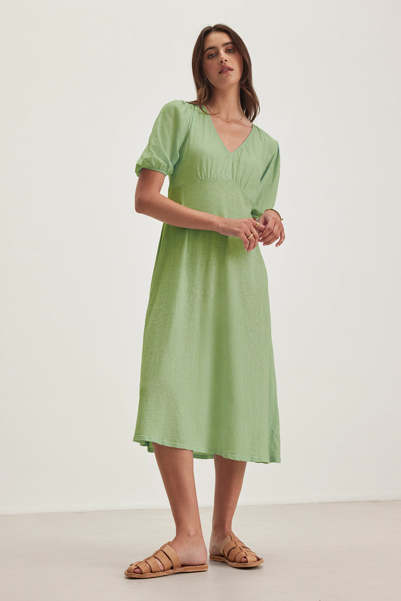 Lovely color, fit and fabric. Super light! It’s more of a mint color, than a sage. I sized down on this one and glad I did. Usually I wear a medium in Velvet dresses but went for a small. Will get a lot of use out of this one this summer.