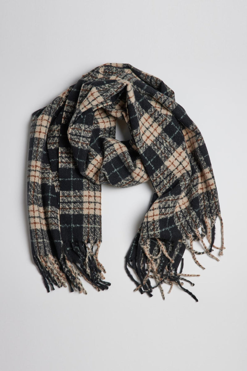A classic accessory that will upgrade any look. This scarf features a traditional plaid pattern with fringe ends. Perfect for covering up on chillier days.