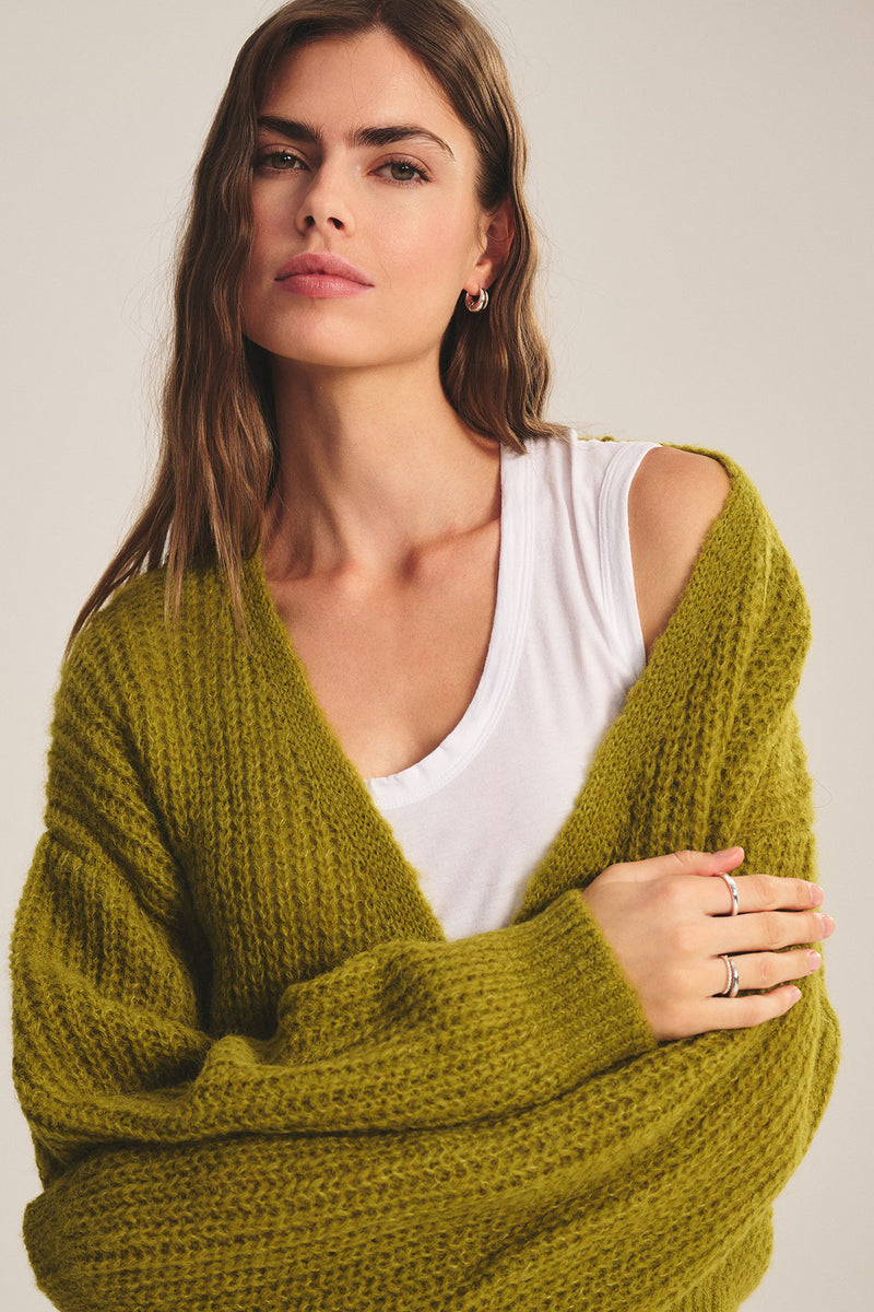 A woman with long brown hair wears the RANYA ALPACA CARDIGAN by Velvet by Graham & Spencer in textured olive green over a white shirt, looking at the camera with a neutral expression—ideal for effortless layering.
