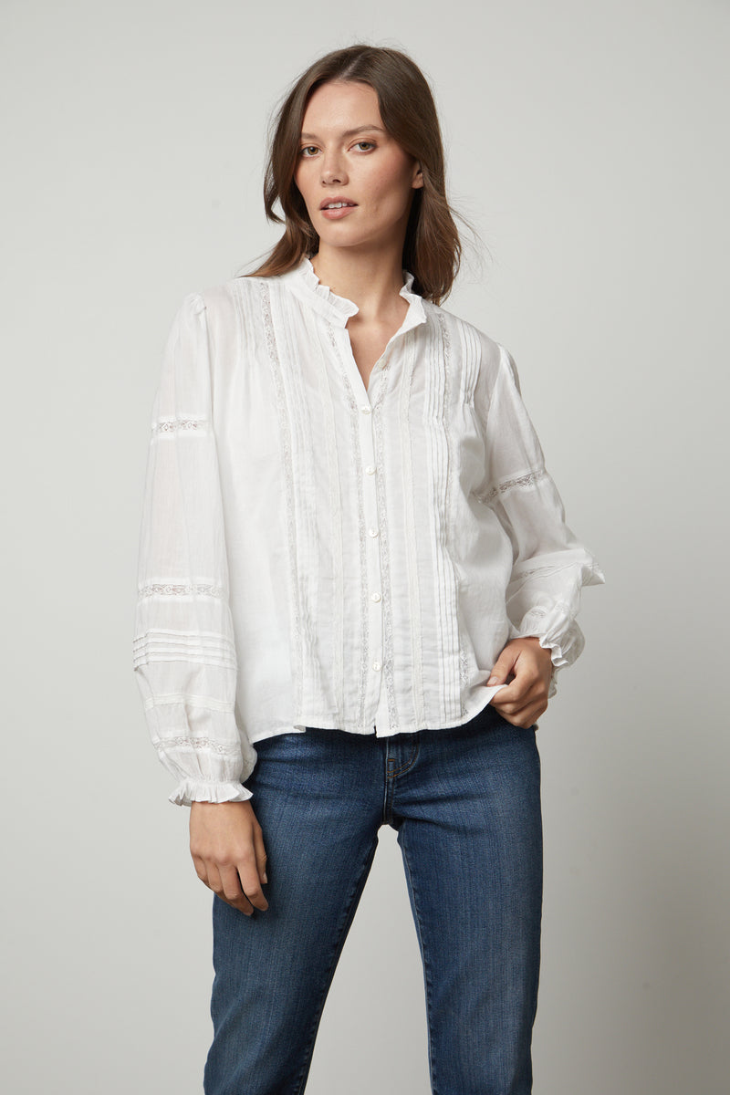 Featuring romantic cotton lace accents, a button front, and a V-neck for a flattering fit. Give your look a boho-inspired flair. Comes with a detachable camisole for added coverage.