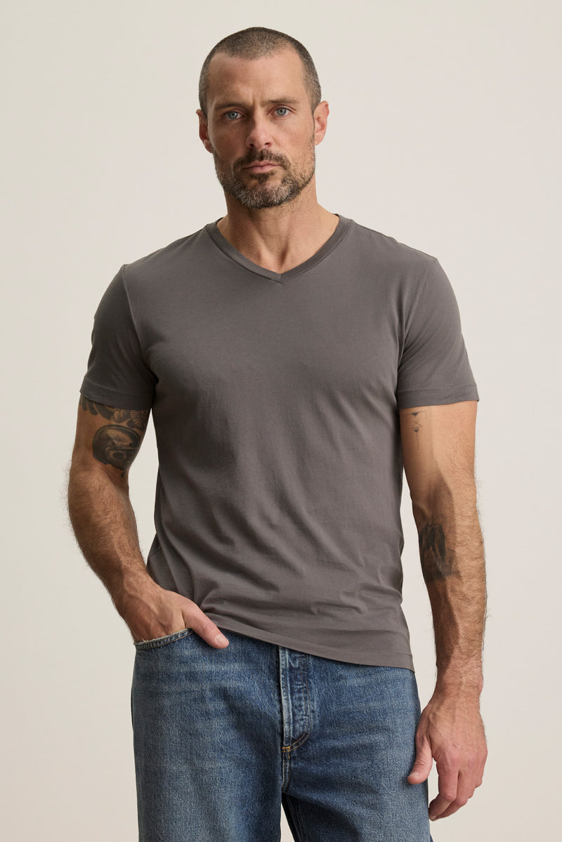 Crafted from the highest quality Pima jersey, this tee features a subtle v-neckline and short sleeves. Designed with a slightly slimmer cut, it's perfect for layering and everyday wear.