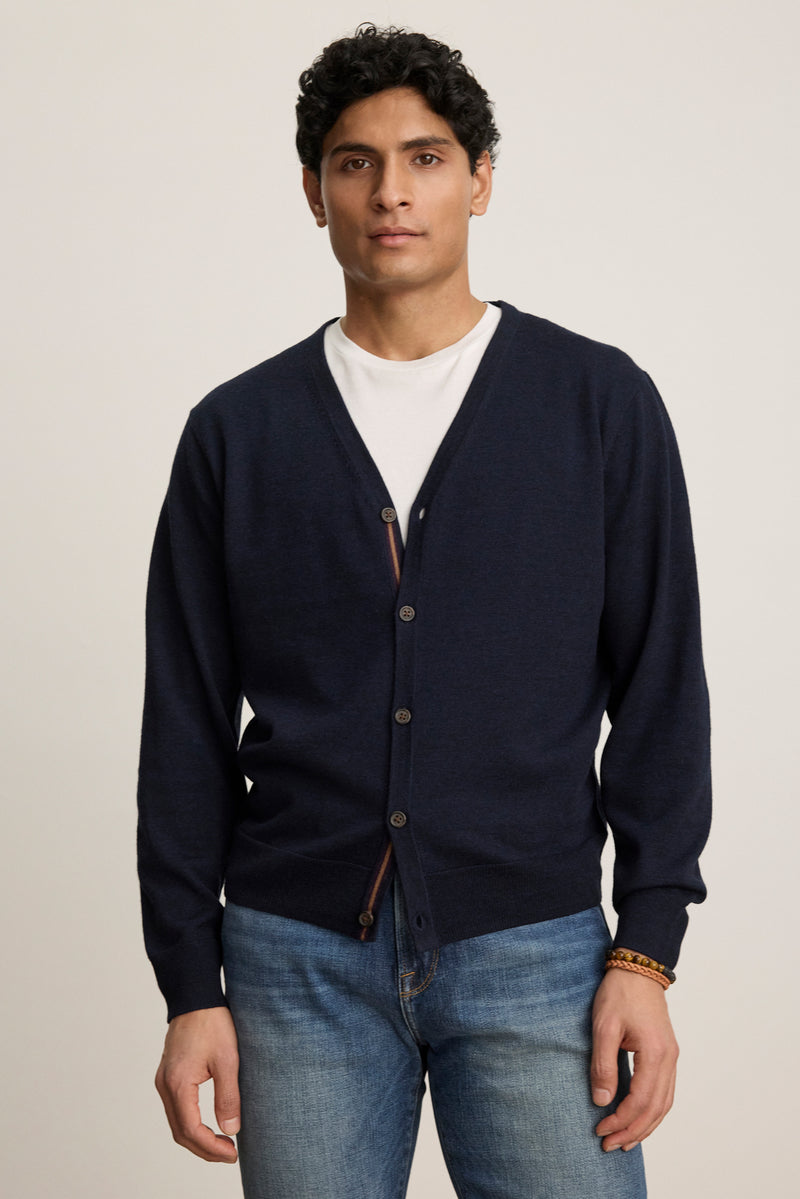 Built for versatility, this cardigan is crafted from a soft, premium wool that layers easily without bulk. It features a five-button front, V-neckline, and ribbed trims, with contrast piping along the inner placket and neckline for a clean, polished finish.