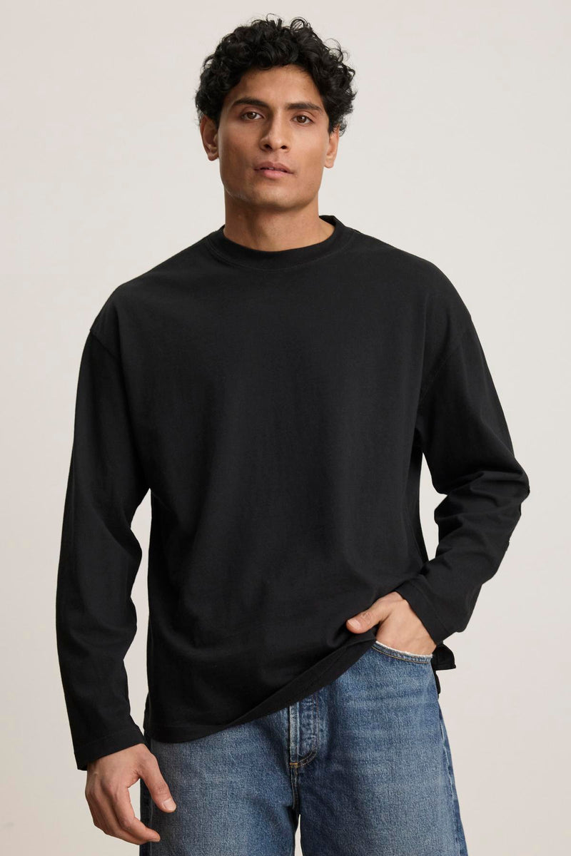 Crafted from structured pima cotton jersey, this tee offers a relaxed fit with details like a ribbed crew neckline, drop shoulders, and self-fabric raw edge elbow patches. Contrast stitching along the shoulder line and a slightly curved side split hem add a refined finish, making it a versatile addition to your wardrobe.