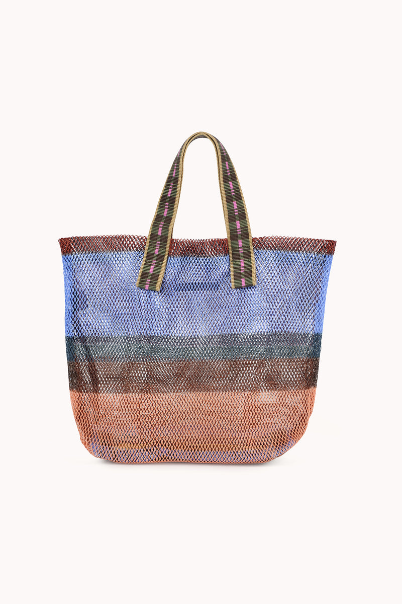 Close-up of the SMALL STRIPED MESH TOTE BY EPICE, featuring bold blue, brown, and orange bands with striped handles—Epice’s tote blends striking colors and natural fibers in a compact, stylish design.