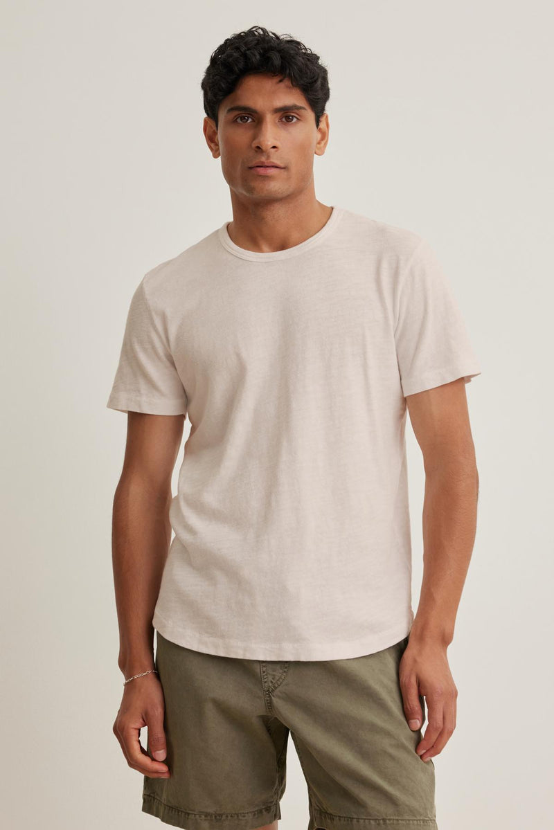 This tee is crafted from the highest quality mid-weight Peruvian cotton slub. Designed for versatility and comfort, it boasts a relaxed fit, classic crew neckline, and a curved hemline. Ideal for achieving a laid-back, lived-in feel with every wear.