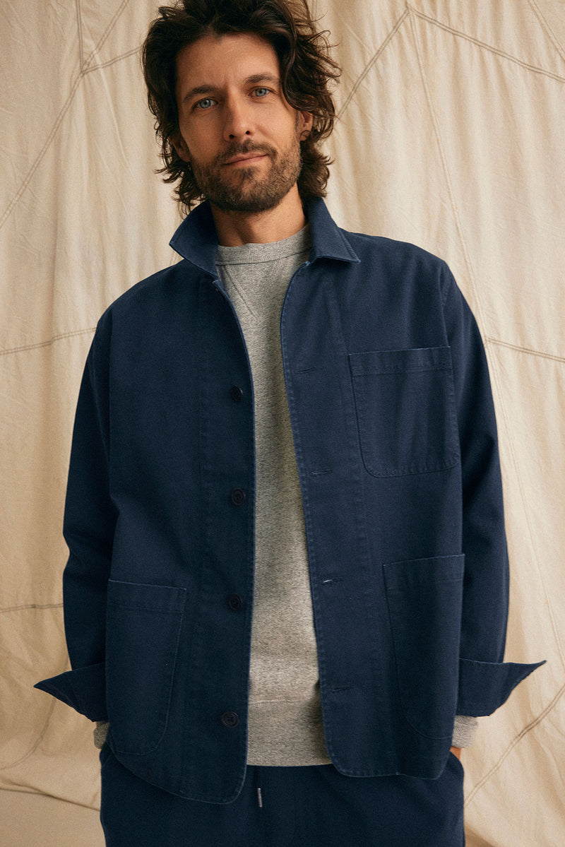 This chore jacket is crafted from mid-weight cotton twill, offering durability and ease. It features a button front, a classic collar, and patch pockets at the chest and front, making it a functional and timeless layer.