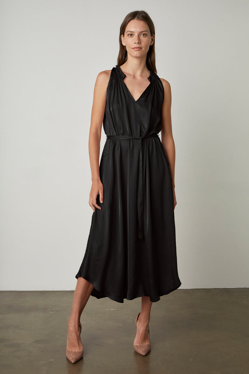 Crafted from a luxe viscose woven that has a glam sheen and gorgeous drape, this frock is the ultimate party piece. Featuring a v-neckline and detachable belt, the silhouette flows out into a flattering curved hemline.