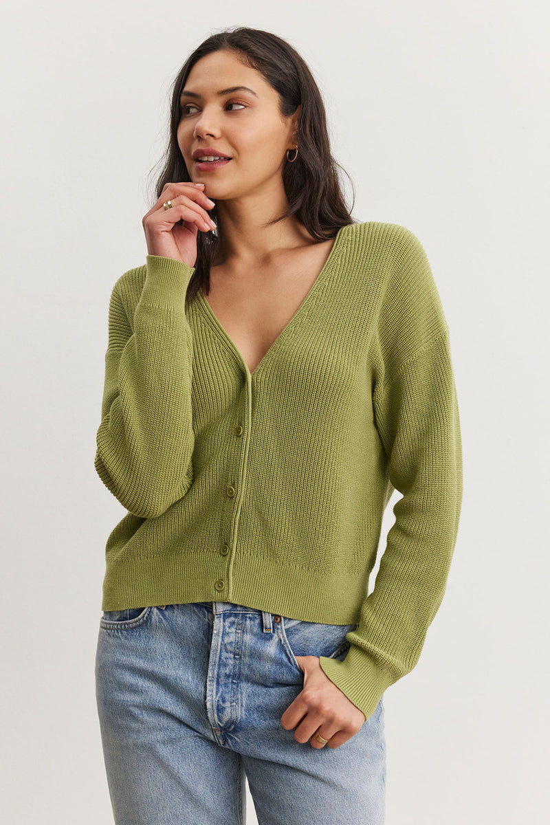 A versatile addition to your wardrobe for those breezy summer days and cooler evenings. Crafted from textured cotton knit, this cardigan features a slightly cropped silhouette and a relaxed fit for easy layering. The ribbed cuffs and hemline add a touch of detail, while the rolled placket and five-button front give it a casual yet refined look. Perfect for pairing with your favorite jeans or over a sundress for a laid-back, stylish ensemble.