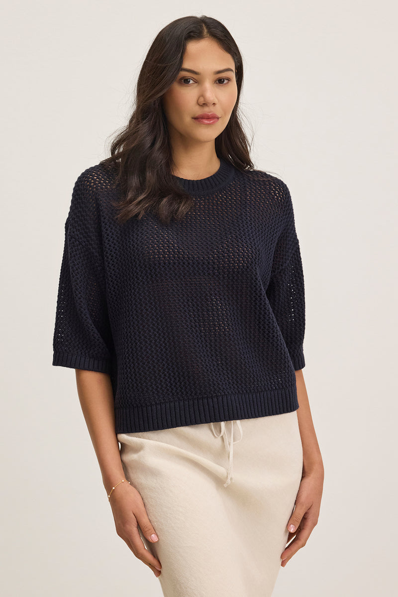 Crafted from soft cotton cashmere mesh, this sweater offers a lightweight feel with a relaxed, boxy fit. The crew neckline, elbow-length sleeves, and ribbed trims provide timeless details for everyday styling.