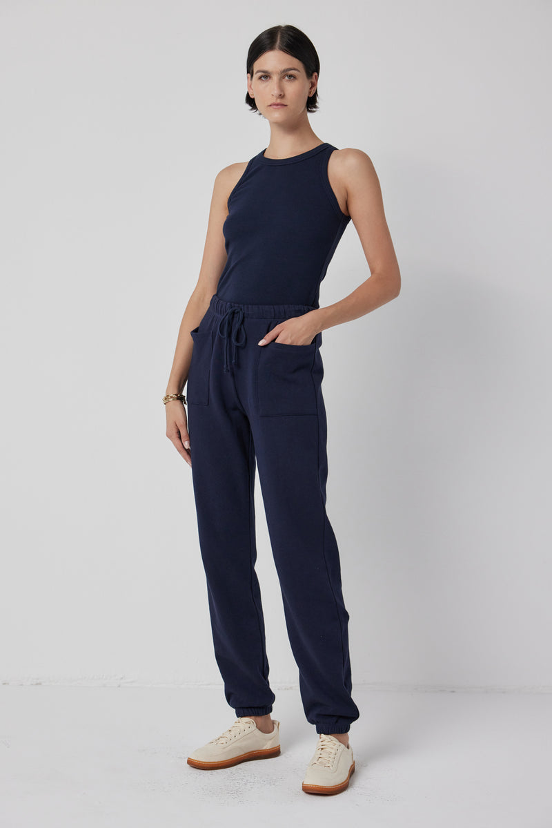 Crafted from soft organic cotton fleece, these sweatpants offer a cozy feel for lounging or running errands. The elastic drawstring waist ensures a customized fit, while the two front patch pockets add functionality. Finished with elastic cuffs, these sweatpants provide a relaxed silhouette that pairs effortlessly with your favorite tops for a laid-back look.