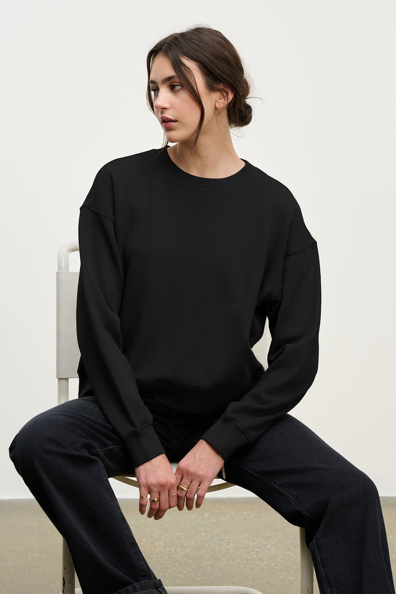 Crafted from an organic fleece that’s cozy on the inside and with thoughtful details like exaggerated seams, a dropped shoulder and slight crop. Great slouch but zero bulk, which is what makes it amazing.